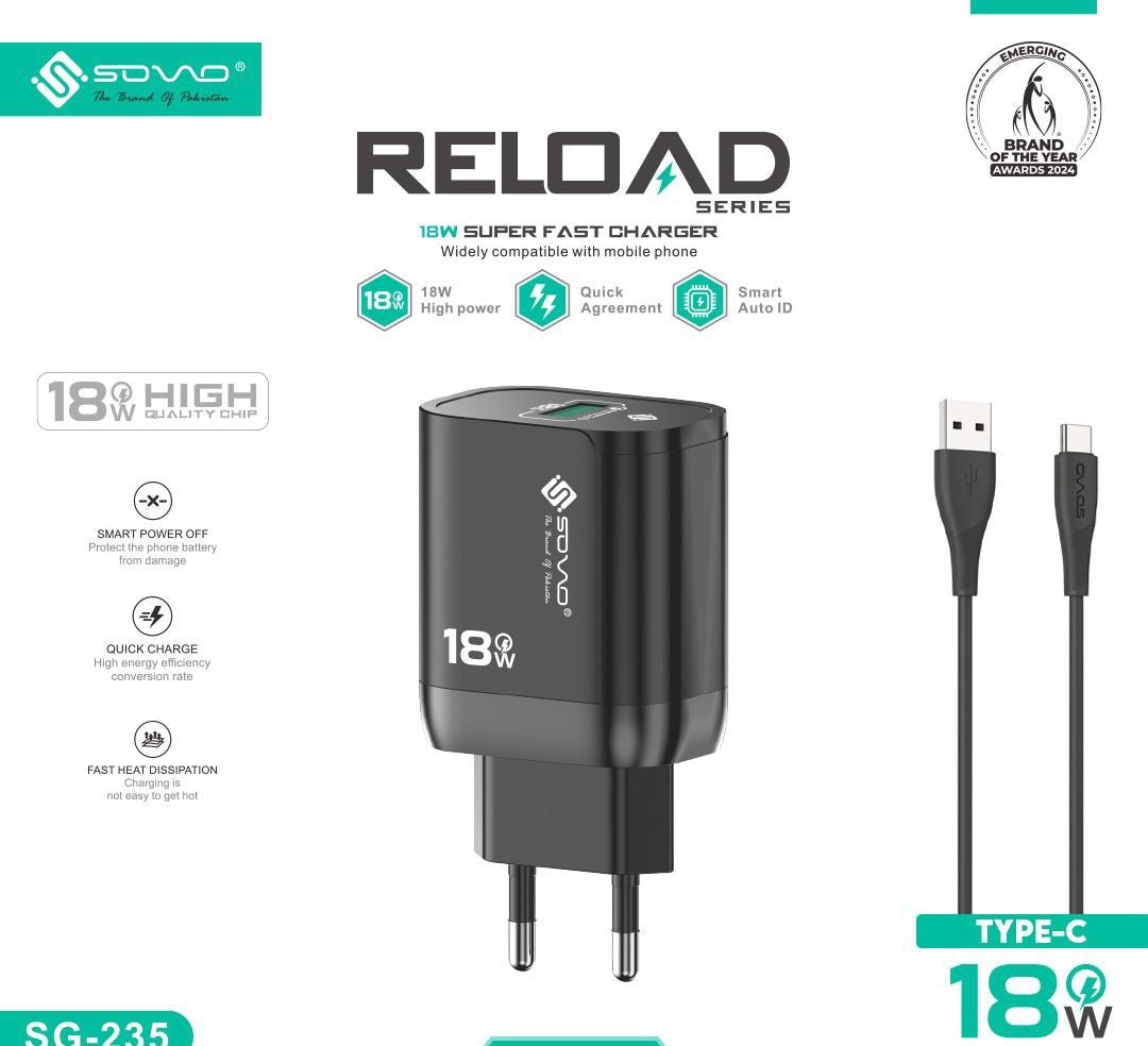 SOVO SG-235 | Type-C 18W Super Fast Mobile Charger with Micro USB Cable | Quick Charge 3.0 | Safe & Durable Adapter